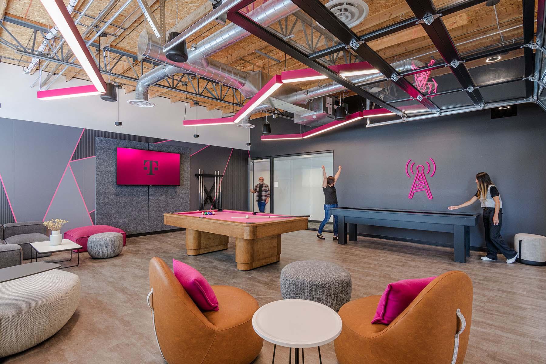 Aligning with T-Mobile’s bold color scheme, Seem 1 Acoustic Direct/Indirect in T-Mobile Magenta and Seem 1 Acoustic Unlit in T-Mobile Magenta are diagonally suspended in the open gathering space. These acoustic solutions enhance the room’s cohesiveness while improving sound quality. Additionally, dynamic, zig-zagging Seem 4 LED Direct contributes to the visual energy of the collaborative spaces, further enhancing the modern and flexible design. Seem 1 Acoustic Trio Direct in the customized T-Mobile Magenta color seamlessly matches the seating area, adding a playful touch and contributing to a well-coordinated common area.