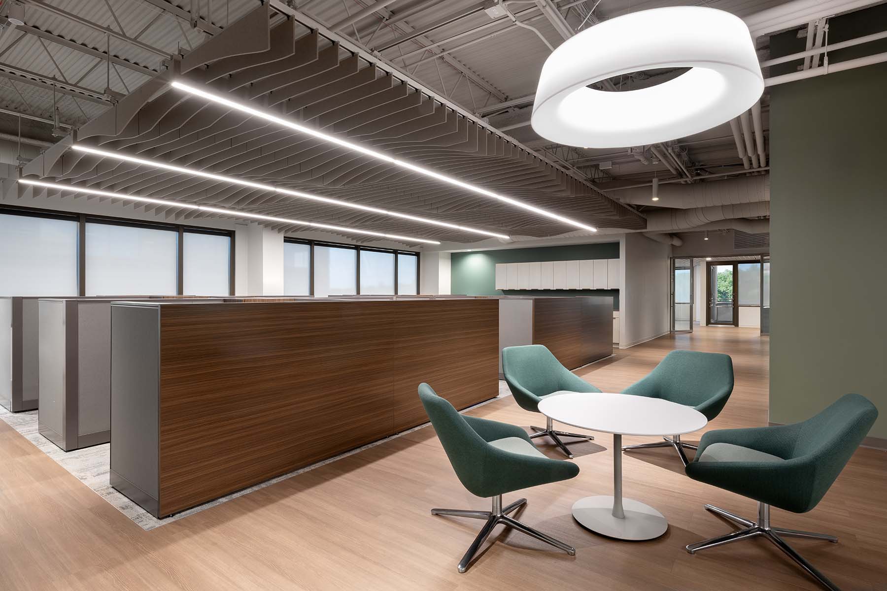 Focal Point’s ID+® 3.5” x 3.5” Downlights and Seem® 1 Recessed luminaire were strategically integrated to provide balanced, glare-free illumination that complements the clean architectural lines and natural materials. The downlights offer focused, discreet lighting in offices and conference rooms, while Seem® 1 Recessed delivers consistent linear illumination throughout corridors and shared areas. A Mora® array with integrated Seem 1 Acoustic linear luminaires provides the perfect mix of visual and acoustical comfort over the workstations and enhances the open ceiling architecture. Together, these solutions bring together the refined design, tailored for a financial services setting.