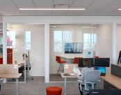 Previously spread between two office buildings, Cushman & Wakefield brokers now collaborate in one location, a new sprawling 28,000 square-foot downtown Denver office. Selected for its premier view and proximity to downtown amenities, it was designed with the goal to provide an engaging client experience, one that begins the moment guests walk in. Sweeping views of the mountains greet staff and guests as they enter the bright and airy lobby. Glass walls and recessed luminaires were selected to eliminate visual clutter and add to the modern aesthetic.