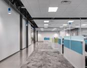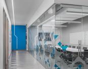The modern office floor plan includes private offices, conference rooms with glass walls, open office workstations, and a large breakroom. The facility exemplifies the company’s vision of innovate to elevate lives, where a custom Seem 1 recessed wall-to-ceiling pattern runs the length of the wall in the main hallway and a blue painted logo wall, reflective of the company’s corporate color, greets visitors in the entry. The dynamic design continues throughout the office where ID+ 4.5" Cylinders with a super wide flood distribution are suspended in the workspace area and breakroom, delivering pools of light and elevating the interior design with a custom blue finish that matches the company’s signature corporate color.
